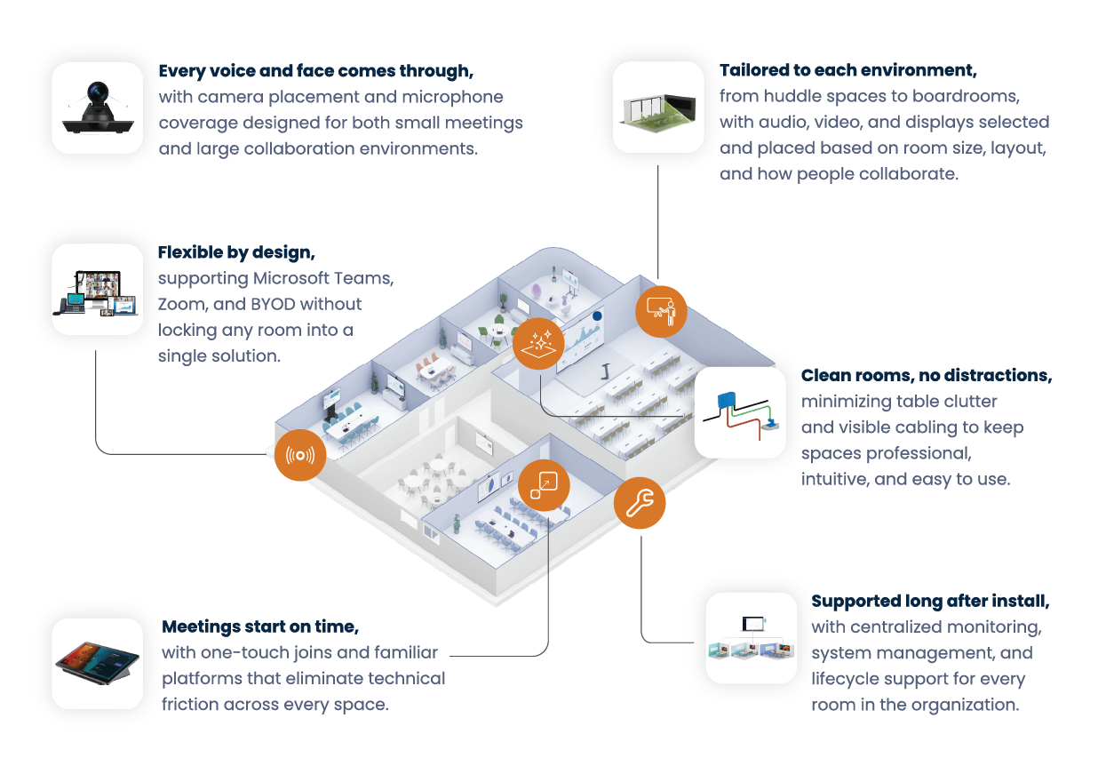When conference rooms are thoughtfully designed, meetings start on time, hybrid teams collaborate naturally, IT tickets drop, and productivity goes up..