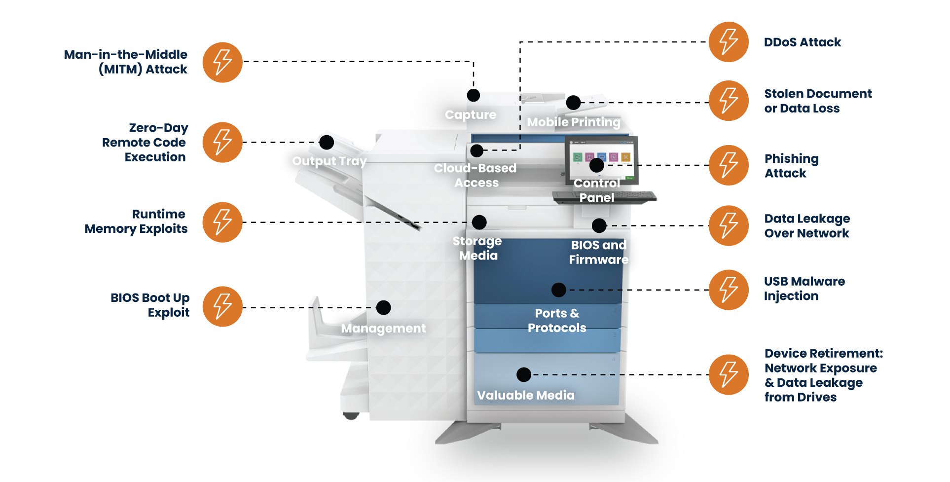 Printers are targeted because they operate as fully connected endpoints. A multifunction printer stores scanned images, holds user address books, caches print jobs, and communicates with cloud and mobile workflows. Each of these capabilities creates a potential attack surface.